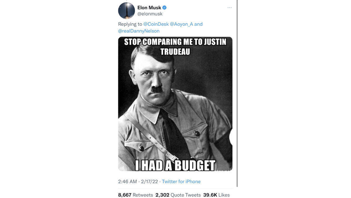 Es ist nicht der erste Shitstorm, den Tesla-Chef Elon Musk wegen eines Tweets abbekommt, aber es dürfte der mit Abstand heftigste sein. Nachdem er gestern ein Bild von Hitler mit dem Text "Stop comparing me to Justin Trudeau – I HAS A BUDGET" ("Bitte vergleichen Sie mich nicht mit Justin Trudeau – Ich hatte ein Haushaltsbudget") postete, gab es heftigste Reaktionen von allen Seiten. Hintergrund des Tweets: Die Regierung Trudeau betreibt in Kanada während der Pandemie und auch schon zuvor eine sehr lockere Fiskalpolitik ohne durch das Parlament verabschiedetes Haushaltbudget. Darüber hinaus hat der kanadische Präsident die Behörden und Finanzinstitute in seinem Land aufgefordert, Kryptotransaktionen einzufrieren, die für die streikenden Truckerfahrer gedacht sind. Auch hier hatte Musk seinen Standpunkt bereits per Tweet mitgeteilt.