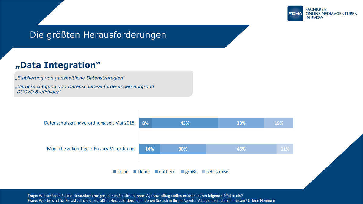 68 Prozent der Befragten (n=40) bewerten das Thema als "große" oder "sehr große" Herausforderung, die immer schwieriger zu bewältigen ist. "Die steigende Komplexität im Mediageschäft bedeutet auch eine gestiegene Anforderung der werbungtreibenden Kunden an die betreuenden Agenturen", sagt Manfred Klaus (Plan.Net Gruppe), Sprecher der FOMA. "Dadurch wird aber auch die Rolle der Agenturen immer wichtiger. Wir sind als Berater gefragt und als Wirkungswächter in Zeiten zunehmender Komplexität."