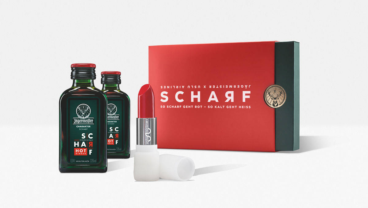 Vor diesem Hintergrund startet der Spirituosen-Hersteller jetzt eine Kooperation mit der Kosmetik-Marke Uslu Airlines. Das Ergebnis ist ein Set - bestehend aus zwei kleinen Probierflaschen des neuen Jägermeister Scharf und einem eigens für die Marketing-Aktion entwickelten Lippenstift in Rot.