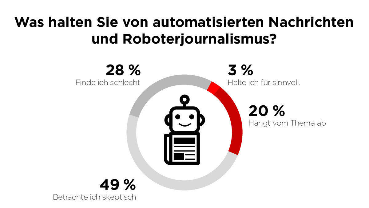 Wenig Fans haben im Bereich der Medienangebote bislang Künstliche Intelligenz und Roboterjournalismus. 45 Prozent der Deutschen sind der Meinung, dass sich diese Technologie nicht durchsetzen wird. Entsprechend skeptisch sehen sie daher auch automatisierte Nachrichten:49 Prozent sind hier eher kritisch, 28 Prozent lehnen diese Art von News ganz ab. Nur drei Prozent halten Roboterjournalismus für sinnvoll.