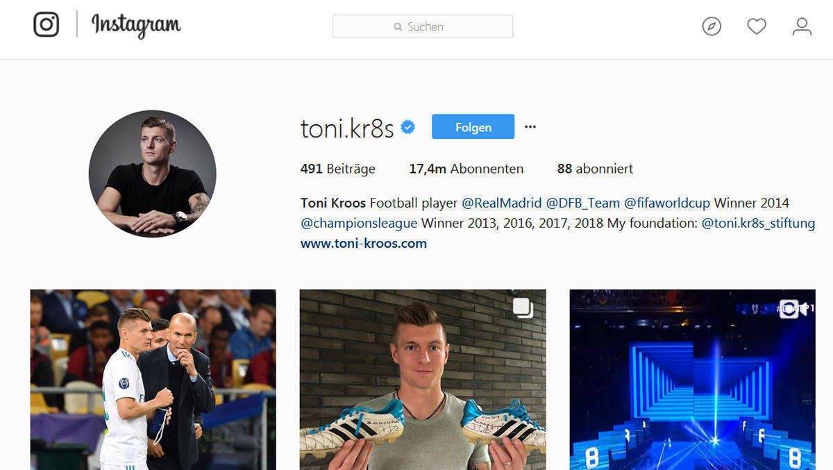 Toni Kroos: 6,9 Mio (Twitter), 17,4 Mio (Instagram), 12 Mio (Facebook)