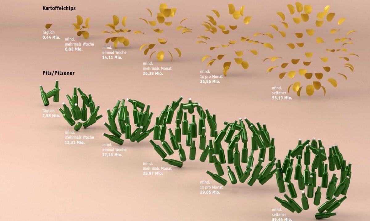 Ähnlich eine Auswertung zum Konsum von Bier und Chips. Die Lieblingskombi zum Fernsehabend, so die Studie. Sich hier nur auf die Intensivverwender zu konzentrieren, würde bedeuten, einen mengenmäßig erheblichen Teil der Zielgruppe außen vor zu lassen. Denn auch die Gelegenheits-Chips-oder Bierfreunde seien umsatzrelevant. In Zahlen bedeutet das: 14 Millionen Konsumenten essen mindestens einmal pro Woche Chips im Vergleich zu 37 Millionen, die nur einmal im Monat zum Knabbergebäck greifen. 22 Millionen potenzielle Käufer gehen beim Fokus auf die Intensivnutzer also verloren. Beim Bier ist es ähnlich: Einmal pro Woche trinken 17 Millionen Deutsche Bier versus 30 Millionen einmal im Monat. Zwölf Millionen Konsumenten werden nicht angesprochen.