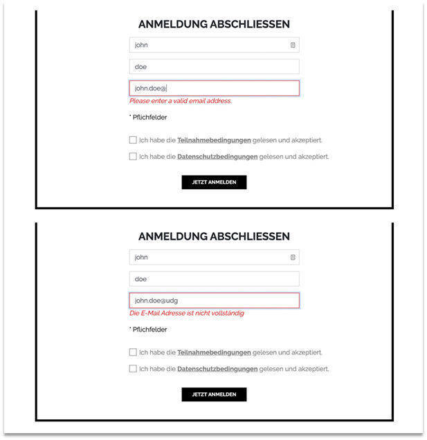 Beim Thema Fehlertoleranz ist uns ein etwas verwirrendes Verhalten aufgefallen: Während bei Falscheingabe das entsprechende Feld markiert wird und ein Fehlertext erscheint, was gut und hilfreich ist, wurde jedoch je nach Eingabe ein anderer Text angezeigt. Gibt man beispielsweise eine E-Mail-Adresse ohne den Domain-Teil ein, erscheint die Fehlermeldung "Please enter a valid email address." Erweitert der Nutzer die Eingabe, in unserem Fall um die Buchstaben "udg", wird folgendes angezeigt: "Die E-Mail Adresse ist nicht vollständig." Das verwirrt und sollte behoben werden – englische Texte sollten natürlich ins Deutsche übersetzt werden.