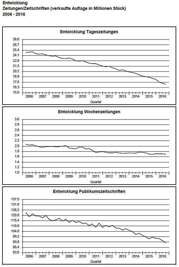 Vor allem die Tageszeitungen kommen nicht zur Ruhe – mit 7,62 Prozent weniger an verkaufter Auflage. Der Einzelverkauf leidet dabei besonders (minus 10,97 Prozent). Bei den Zeitschriften bröckelt es ebenso; hier ist die gesamte verkaufte Auflage der Gattung um 5,57 Prozent zurückgegangen. Wobei viele Neugründungen hier das Gesamtniveau stabilisieren, während vor allem die Tageszeitungen vom Zuwachs bei den E-Paper-Ausgaben profitieren.