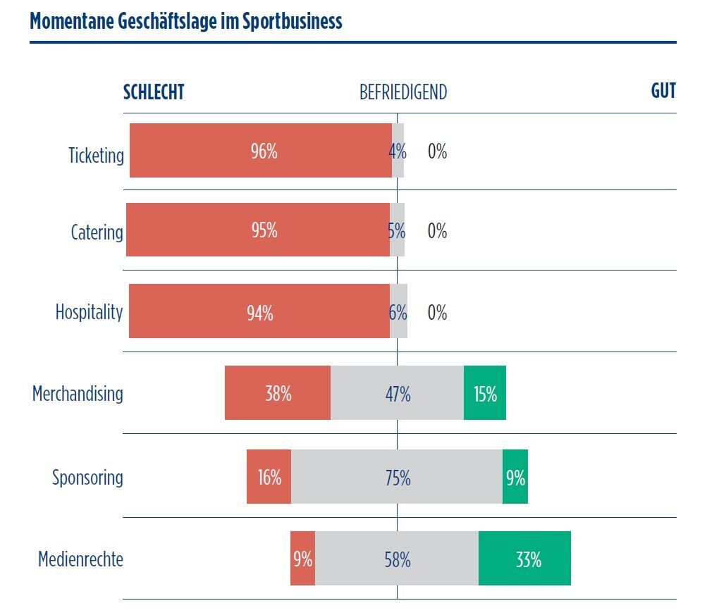 Ebenso liegt der stationäre Verkauf von Fanartikeln brach. Eine weitere Gefahr stelle die Erosion der Fan-Bindung und des Fan-Interesses dar. Außerdem beunruhigen drohende Insolvenzen von Unternehmen im Sportbusiness die Befragten.